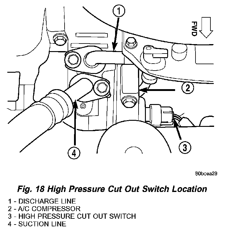 The high pressure cut out switch is located on the rear of the compressor. It turns off the compressor if the system pressure exceeds 3240 kPa (470 psi). The high pressure cut out switch is a factory calibrated unit. The switch cannot be adjusted or repaired and if faulty or damaged, it must be replaced.