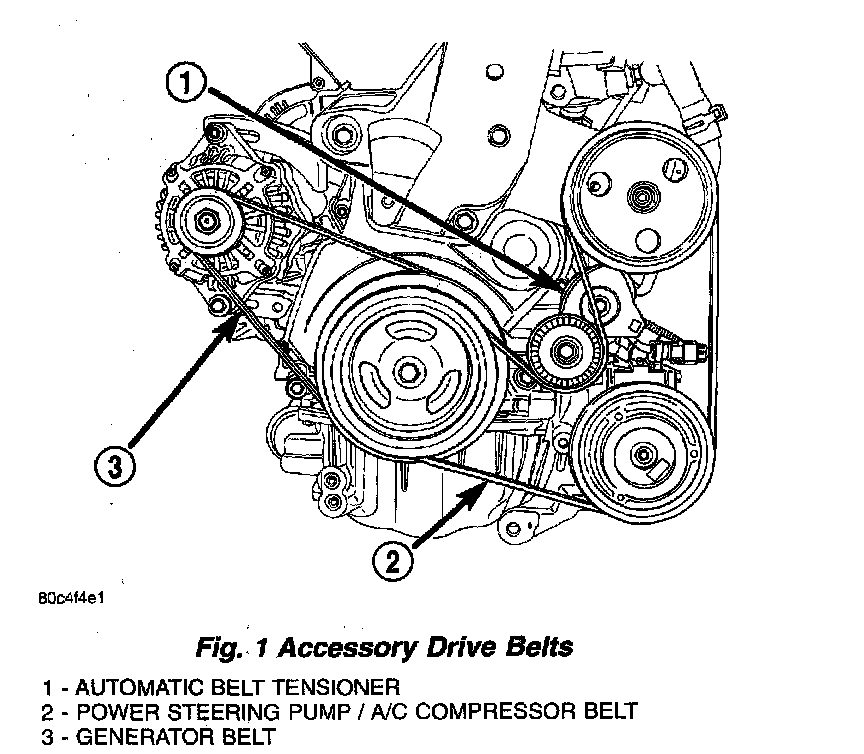 The accessory drive consists of two Poly-V type drive belts (Fig. 1). One belt drives the generator, the other drives the power steering pump and air conditioning compressor. The power steering/air conditioning belt is tensioned by an automatically controlled belt tensioner. The generator belt is manually tensioned using an adjusting bolt and a locking nut.