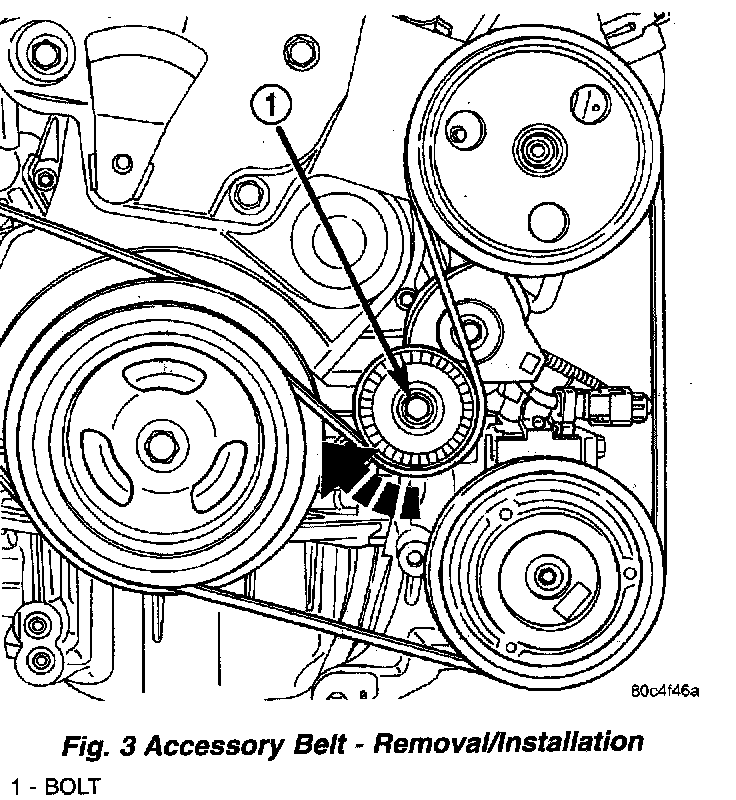 2. Using a wrench, rotate belt tensioner clockwise (Fig. 3) until belt can be installed onto power steering pump pulley. Release spring tension onto belt.