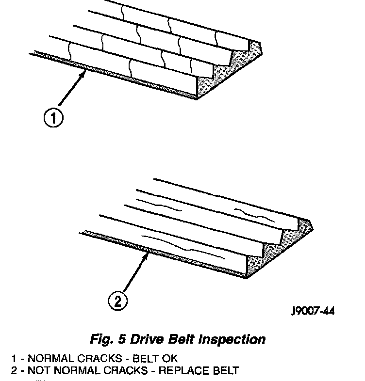 Poly-V Belt system may develop minor cracks across the ribbed side (due to reverse bending). These minor cracks are considered normal and acceptable. Parallel cracks are not (Fig. 5).