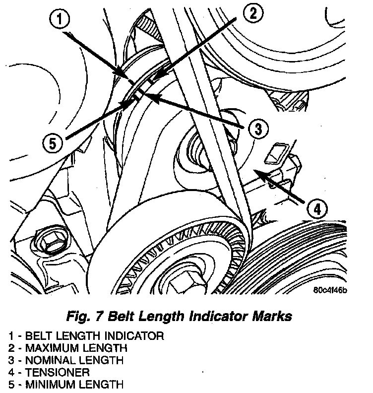 3. After belt is installed, inspect belt length indicator marks (Fig. 7). The indicator mark should be within the minimum belt length and maximum belt length marks. On a new belt, the indicator mark should align approximately with the nominal belt length mark.
