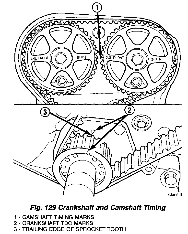 7. Rotate the crankshaft CLOCKWISE two complete revolutions manually for seating of the belt, until the crankshaft is repositioned at the TDC position. Verify that the camshaft and crankshaft timing marks are in proper position (Fig. 137).