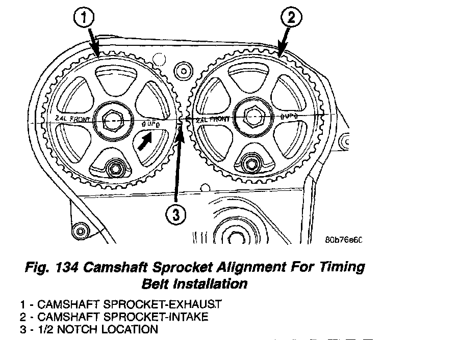2. Set camshafts timing marks so that the exhaust camshaft sprocket is a 1/2 notch below the intake camshaft sprocket (Fig. 134).