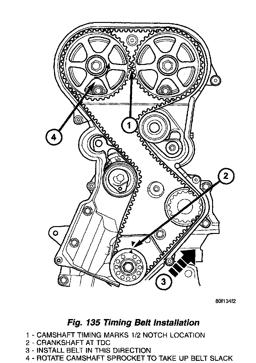 4. Move the exhaust camshaft sprocket counterclockwise (Fig. 135) to align marks and take up belt slack.