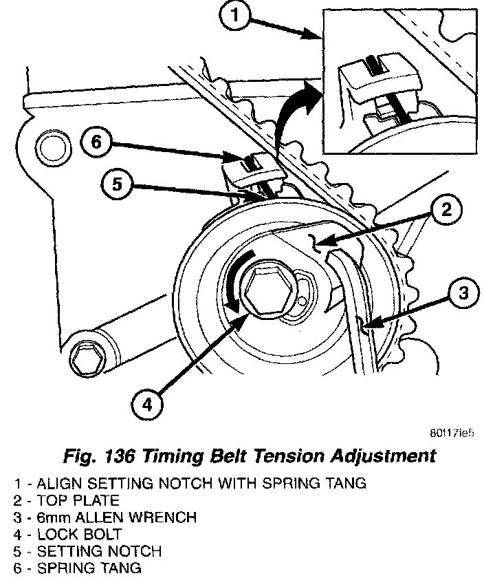 5. Insert a 6 mm Allen wrench into the hexagon opening located on the top plate of the belt tensioner pulley. Rotate the top plate COUNTERCLOCKWISE. The tensioner pulley will move against the belt and the tensioner setting notch will eventually start to move clockwise. Watching the movement of the setting notch, continue rotating the top plate counterclockwise until the setting notch is aligned with the spring tang (Fig. 136). Using the alien wrench to prevent the top plate from moving, torque the tensioner lock bolt to 25 Nm (220 in. lbs.). Setting notch and spring tang should remain aligned after lock bolt is torqued.
