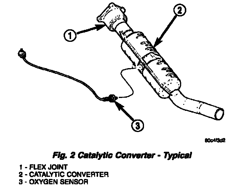 CAUTION: When servicing the catalytic converter, care must be exercised not to dent or bend the flex joint. Should this occur, the flex joint will eventually fail and require the catalytic converter to be replaced. Do not allow the exhaust system to hang unsupported. If the isolators are removed and the catalytic converter is still attached to the exhaust manifold, failure to the flex joint will result.