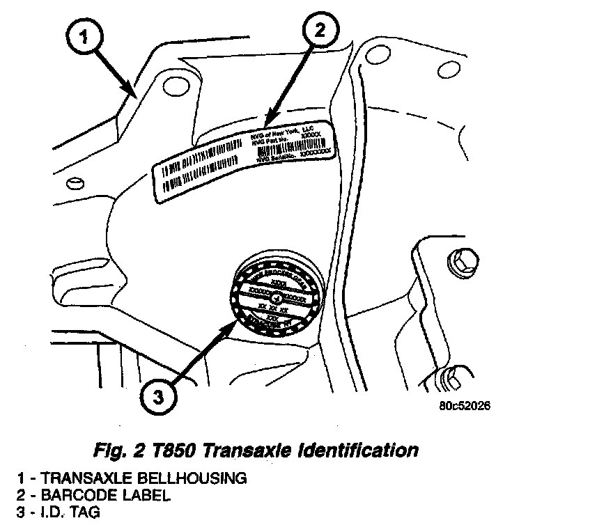 TRANSAXLE IDENTIFICATIONThe transaxle model, assembly part number, build date, and Final Drive Ratio (FDR) can be found on a metal tag fastened to the transaxle case on the bellhousing (Fig. 2). A bar code label is also glued to the transaxle bellhousing, and it too includes the transaxle part number.