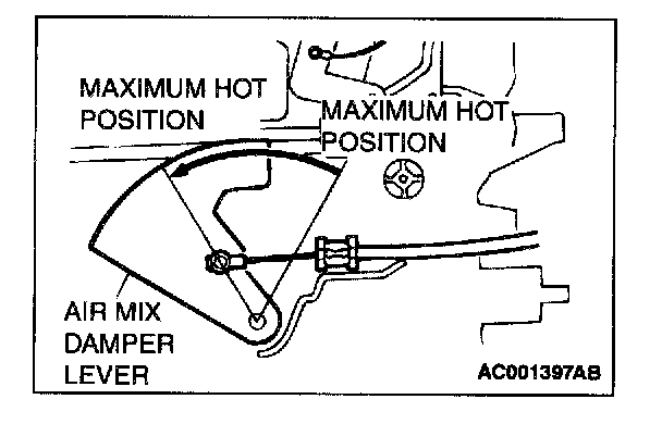 2. Set the air mix damper lever of the heater/cooler unit to the maximum hot position as shown in the illustration, and then connect the cable to the lever pin.