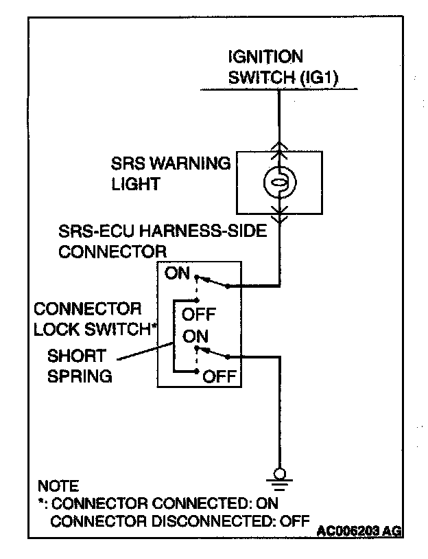 The connector lock switch is a mechanism that shorts the power supply terminal to the ground terminal automatically in the warning light circuit when the connector is disconnected. Its structure is similar to the squib circuit connector shorting mechanism.