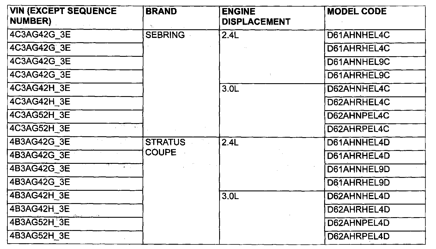 Vehicle Identification Number List:
