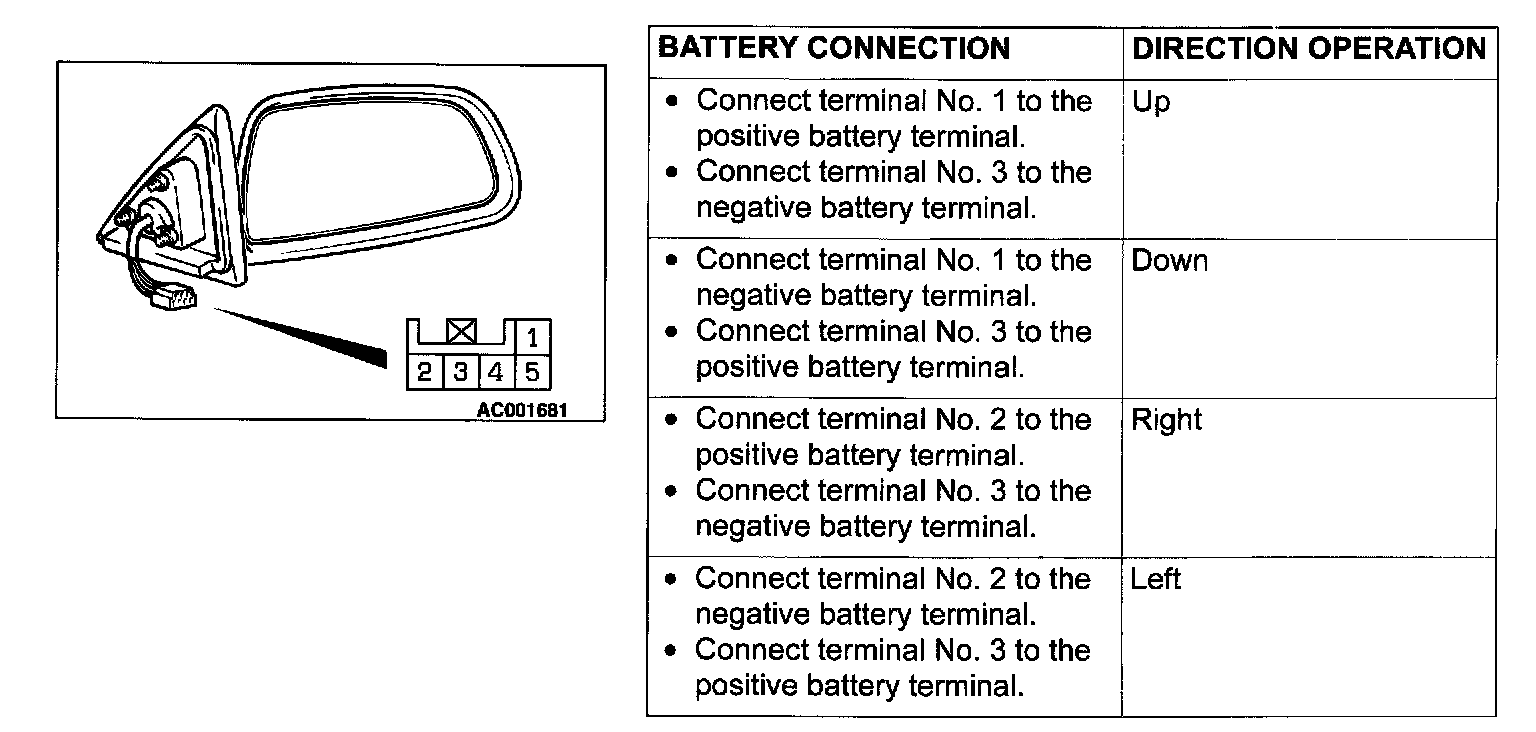 Check that the mirror moves as described in the table when each terminal is connected to the battery.