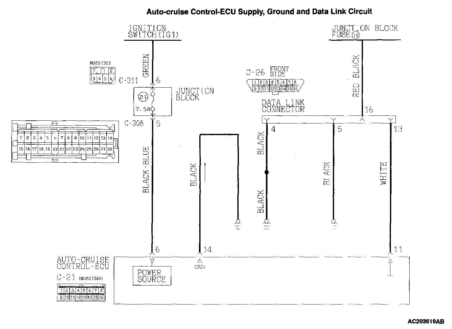 STEP 8. Check the harness wire between auto-cruise control-ECU connector C-21 terminal 11 and data link connector C-26 terminal 13 for damage.