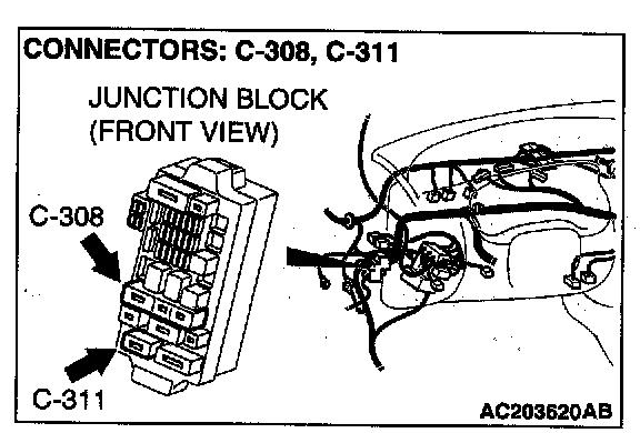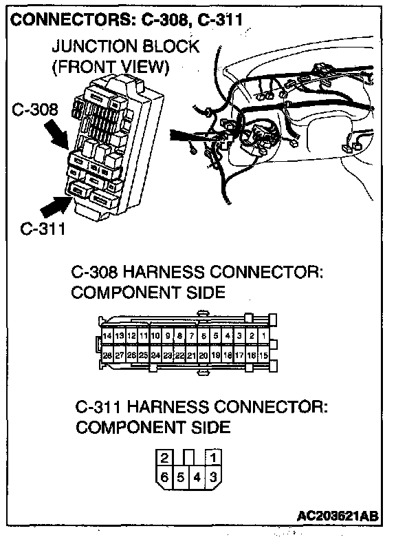 STEP 2. Check auto-cruise control-ECU connector C-21 and Junction block connector C-308 and C-311 for loose, corroded or damaged terminals, or terminals pushed back in the connector.