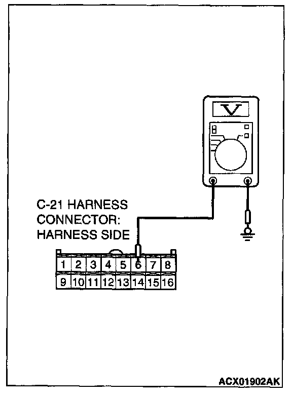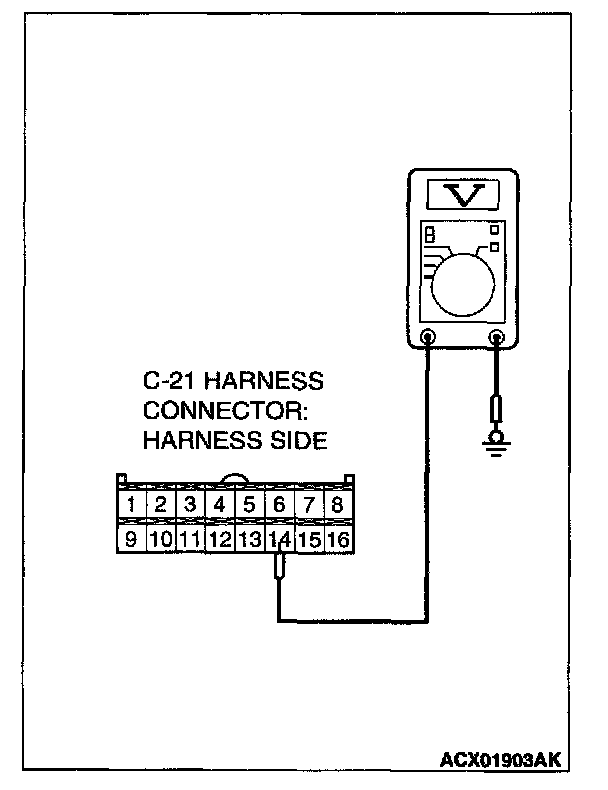 3. Measure the voltage between auto-cruise control-ECU connector C-21 terminal 14 and ground by backprobing. The voltage should measure 0.5 volt or less.