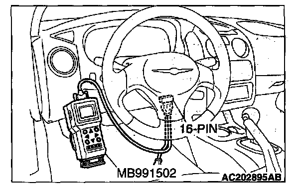 CAUTION: To prevent damage to scan tool MB991502, always turn the ignition switch to the LOCK (OFF) position before connecting or disconnecting scan tool MB991502.