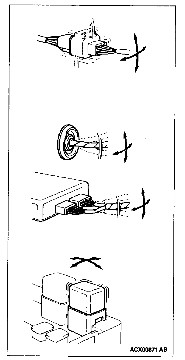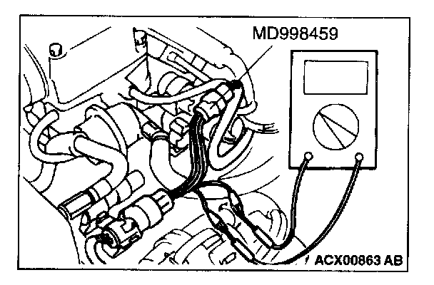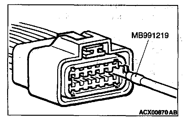 Be sure to use special tool, MD998459. Never insert a test probe from the harness side, as this will reduce the waterproof performance and result in corrosion.