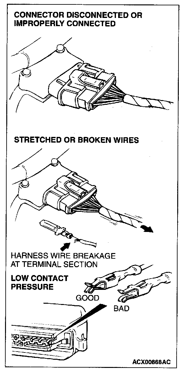 The inspection harness for connector pin contact pressure should be used. The test probe should never be forcibly inserted, as it may cause a defective contact.
