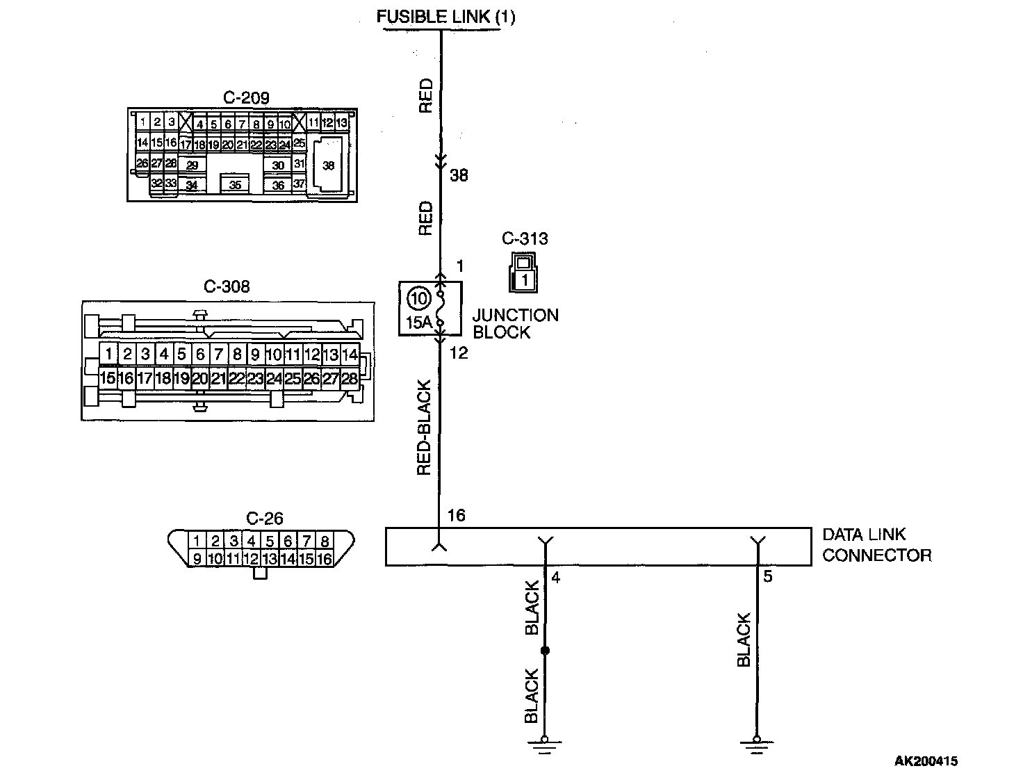 NO: Check harness connectors C-308, C-313 and C-209 at intermediate connector for damage, and repair or replace as required. Refer to Harness Connector Inspection. If intermediate connectors are in good condition, repair harness wire between fusible link (1) and data link connector C-26 (terminal No.16) because of open circuit. Then confirm that the malfunction symptom is eliminated.