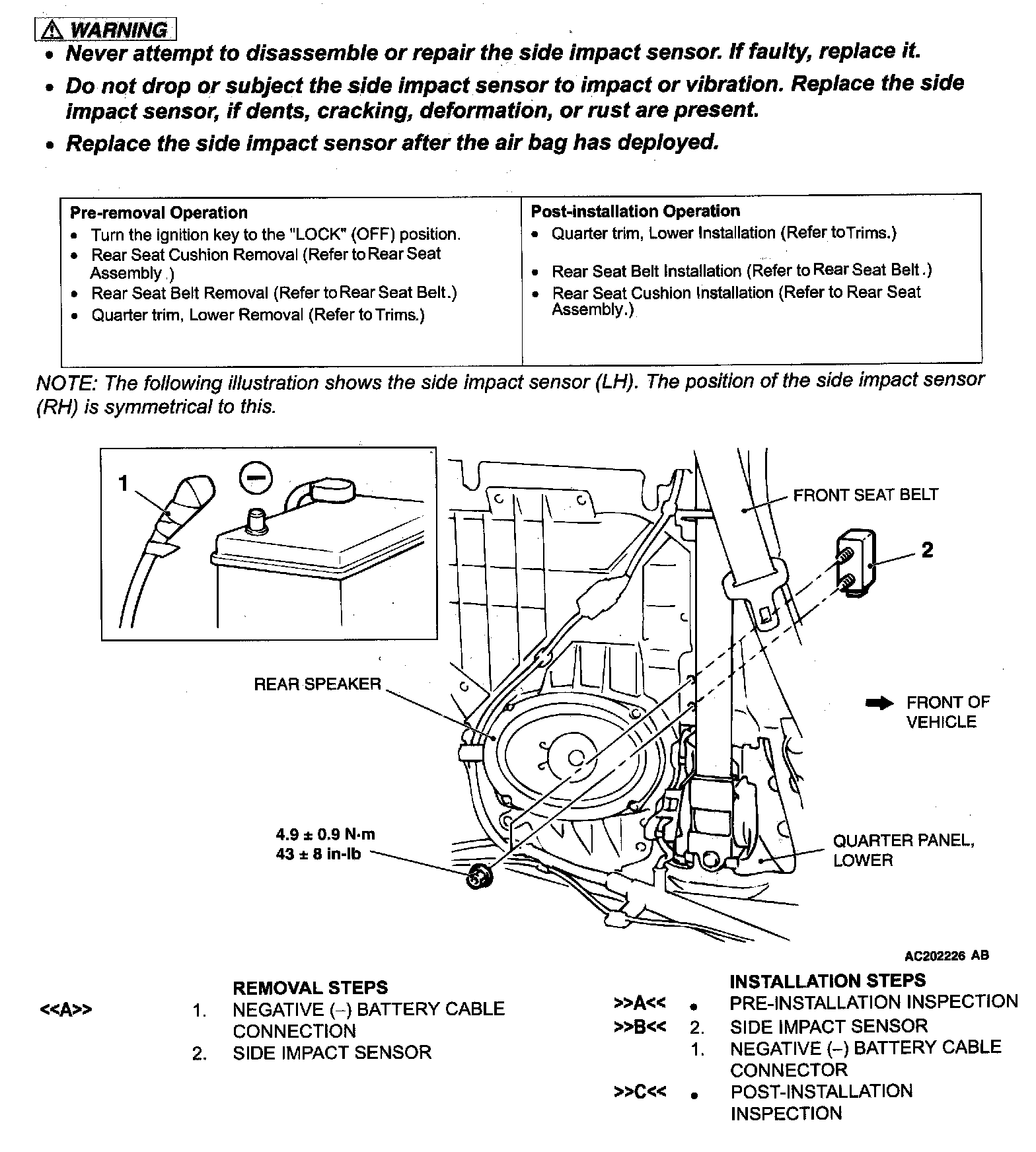WARNING: If the side impact sensor is not installed securely and correctly, the side-airbag may not operate normally. Securely connect the connector.