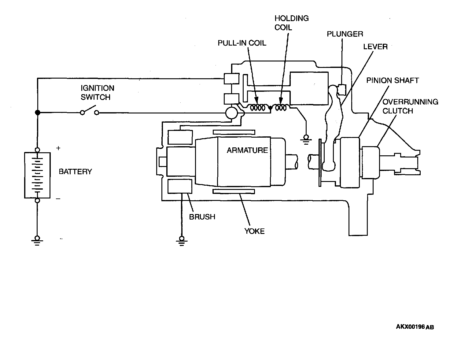 If the ignition switch is turned to the START position, current flows in the coil provided inside magnetic switch, attracting the plunger. When the plunger is attracted, the lever connected to the plunger is actuated to engage the starter clutch. On the other hand, attracting the plunger will turn on the magnetic switch, allowing the B terminal and M terminal to conduct. Thus, current flows to engage the starter motor.