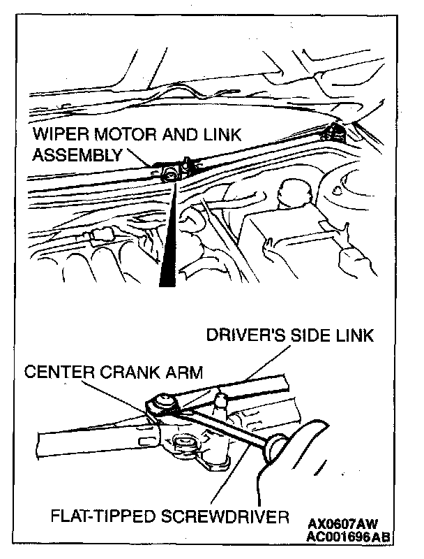 CAUTION: Be careful not to damage the windshield glass when removing the wiper motor and link assembly.