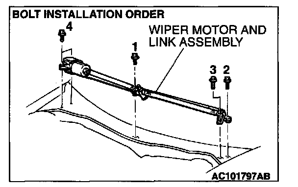 3. Install the four mounting bolts in the shown order to install the wiper motor and link assembly.