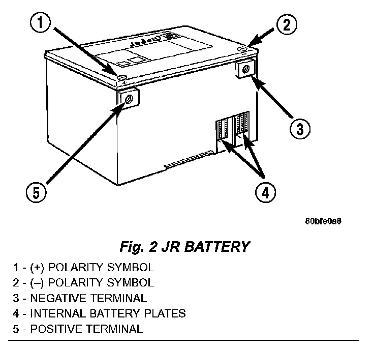 Maintenance-free batteries have non-removable battery vent caps (Fig. 2). Water cannot be added to this battery. Under normal service the composition of this battery reduces gassing and water loss at normal charge rates. If the battery electrolyte level becomes low, this battery must be replaced.