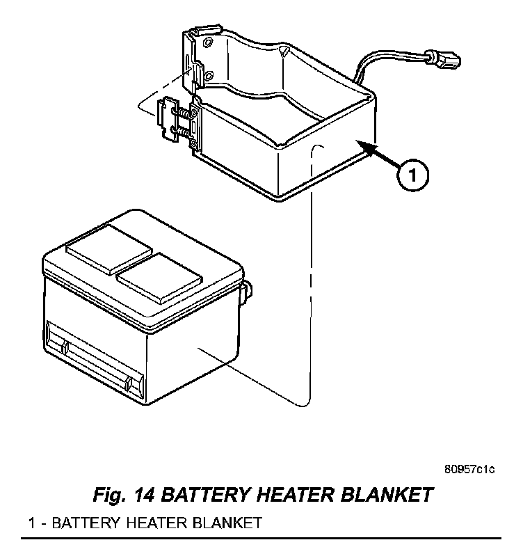 A heater blanket (Fig. 14) is used to improve the battery cold-start ability. This blanket operates on 110 volt AC current and is used with Alaska and Canada cold weather packages.