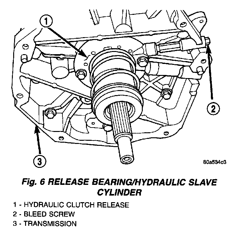 2. Slowly depressing the clutch pedal while opening the clutch slave cylinder bleed screw (Fig. 6).