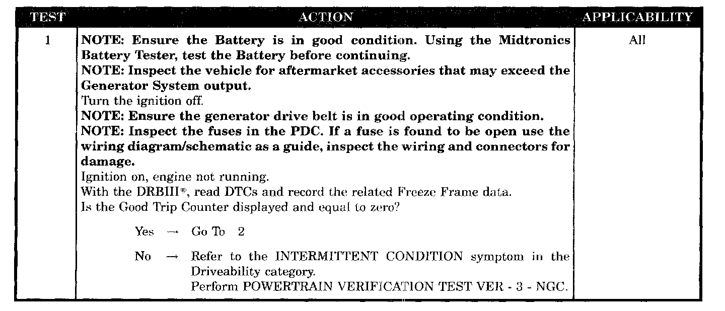 The battery sensed voltage is 1 volt below the charging goal for 13.47 seconds. The PCM senses the battery voltage turns off the field driver and senses the battery voltage again. If the voltages are the same, the code is set. One trip Fault.