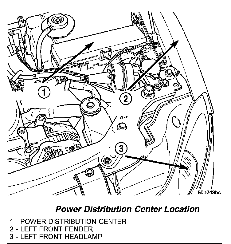 All of the electrical current distributed throughout this vehicle is directed through the standard equipment Power Distribution Center (PDC). The molded plastic PDC housing is located in the left front corner of the engine compartment, just in front of the coolant reservoir bottle. The PDC housing has a molded plastic cover. The PDC cover is easily removed for service access and has a convenient fuse and relay layout label affixed to the inside surface of the cover to ensure proper component identification. The PDC housing is secured in the engine compartment by one screw to the rear of the PDC and two clips on the front side. A small molded plastic protective cover on the front right side of the engine compartment is unsnapped to access the battery/generator cable input connection studs.