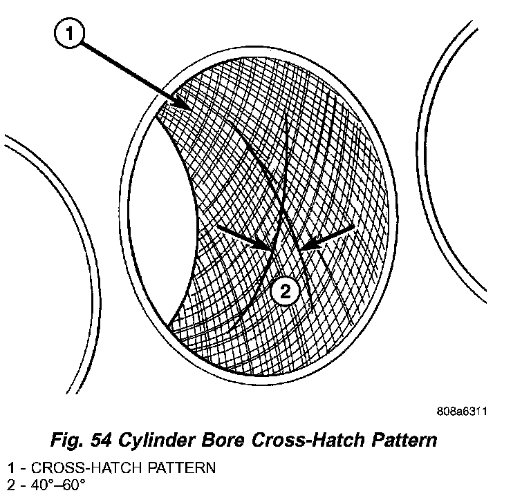 3. Honing should be done by moving the hone up and down fast enough to get a cross-hatch pattern. When hone marks intersect at 40 - 60 degrees, the cross hatch angle is most satisfactory for proper seating of rings (Fig. 54).