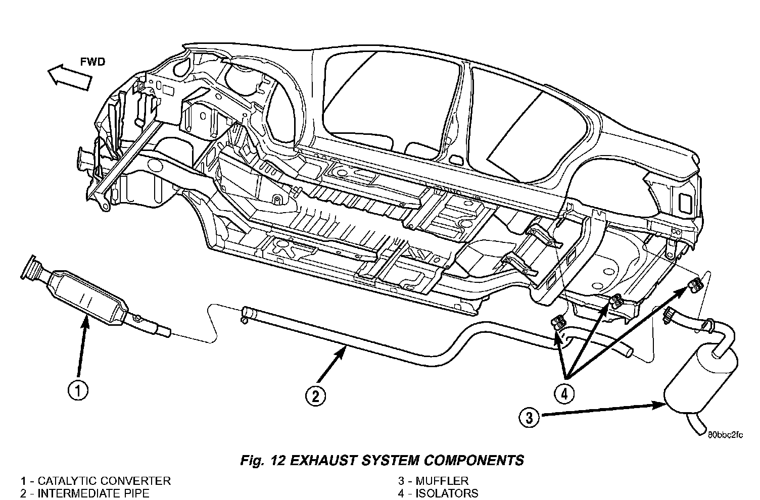 3. Loosen band clamp and remove support isolators at muffler. Remove muffler from exhaust pipe (Fig. 12).
