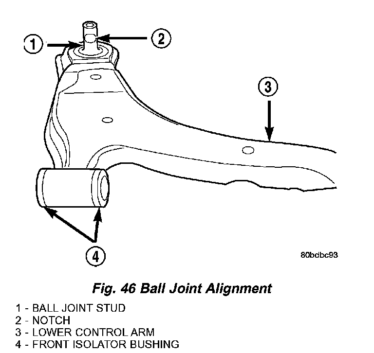 ASSEMBLY - LOWER CONTROL ARM (BALL JOINT)CAUTION: When installing a ball joint in its mounting hole in the lower control arm, position the ball joint so the notch in the ball joint stud is facing the lower control arm front isolator bushing (Fig. 46). This will ease assembly of the ball joint to the steering knuckle when the installation of the pinch bolt is attempted.