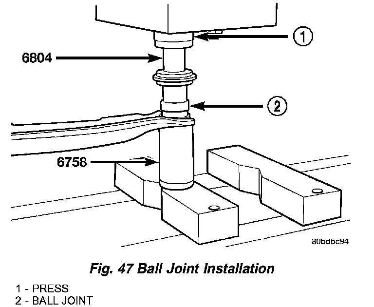 2. Position the Installer, Special Tool 6758, on a hydraulic press to support the lower control arm (Fig. 47). Place the control arm on top of Tool 6758 in the upside-down position, aligning the ball joint stud squarely with the Installer's cup.