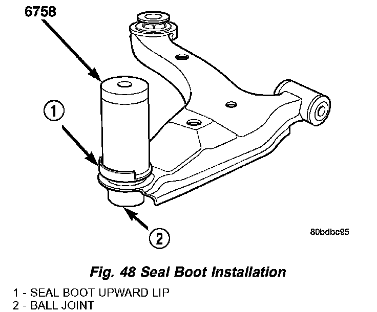 CAUTION: When installing the sealing boot on the ball joint, position the upward lip on the outside perimeter of the seal boot outward, away from the control arm once installed (Fig. 48). It is there to help shield heat from the sealing boot.