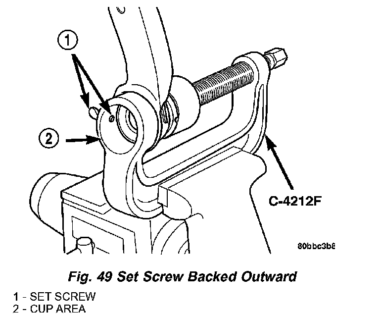 1. Back the Ball Joint Press, Special Tool C-4212F, set screw outward so it does not extend out into the cup area (Fig. 49).