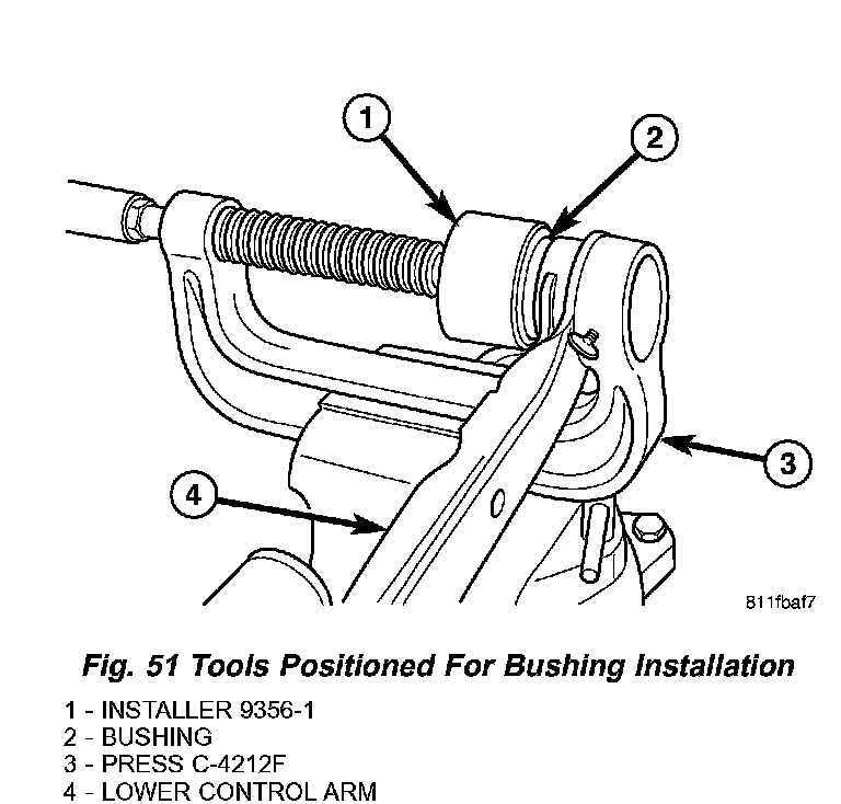 4. Place the lower control arm upper flange against the cup area of the Ball Joint Press and tighten the screw-drive until the Installer contacts the outer circumference of the bushing (Fig. 51). Make sure the bushing flange sits squarely in the step built into the Installer.