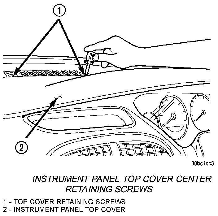 5. Loosen the 2. screws retaining the instrument panel top cover. Located in the defroster grille .