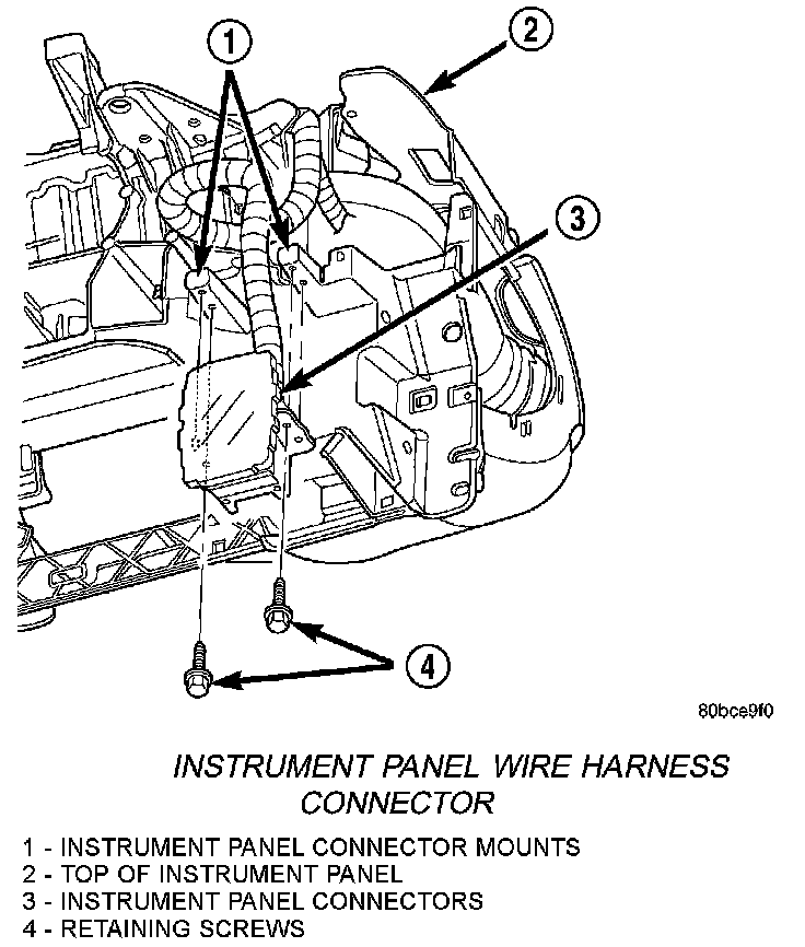 1. Before installing the instrument panel, be certain the 2. instrument panel wire harness connector retaining screws have been removed. The wire bundle should hang between the two connector mounting tabs on the instrument panel.