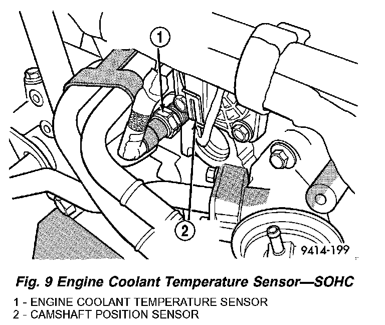 The engine coolant temperature (ECT) sensor threads into the rear of the cylinder head, next to the camshaft position sensor (Fig. 9). New sensors have sealant applied to the threads.