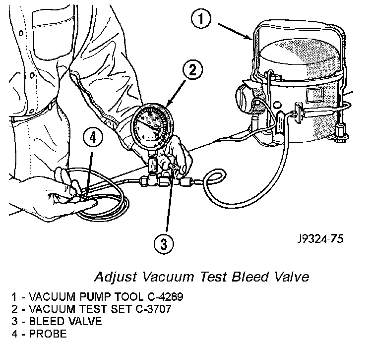 Use an adjustable vacuum test set (Special Tool C-3707-B) and a suitable vacuum pump to test the heater-A/C vacuum control system. With a finger placed over the end of the vacuum test hose probe, adjust the bleed valve on the test set gauge to obtain a vacuum of exactly 27 kPa (8 in. Hg.). Release and block the end of the probe several times to verify that the vacuum reading returns to the exact 27 kPa (8 in. Hg.) setting. Otherwise, a false reading will be obtained during testing.