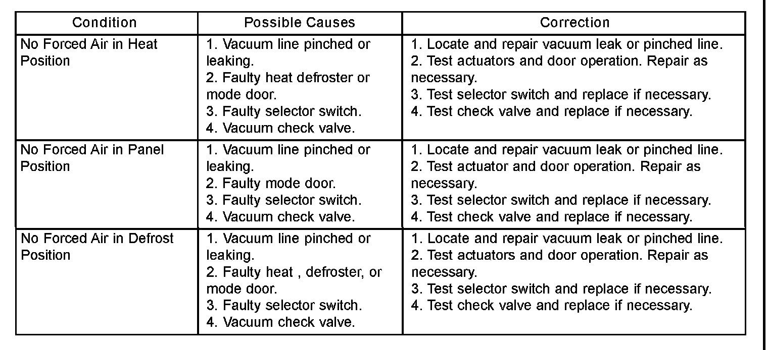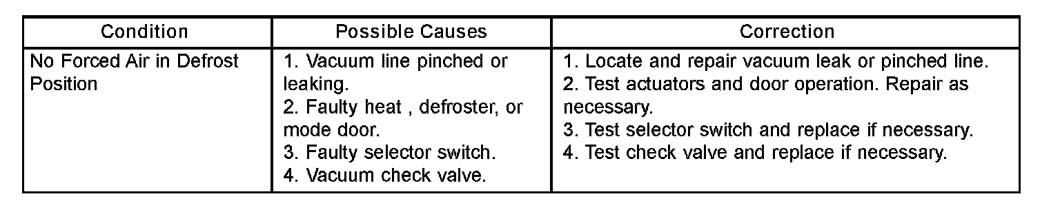 3. Move the recirculation control to the Recirculation position (the recirculation door should move into the Recirculation position). After a short pause move the mode control to the Defrost position (the recirculation door should move to the Outside-air position). The test gauge should return to the calibrated setting of 27 kPa (8 in. Hg.) after each selection is made. If the gauge cannot achieve the calibrated setting, the vacuum circuit or a component has a leak.
