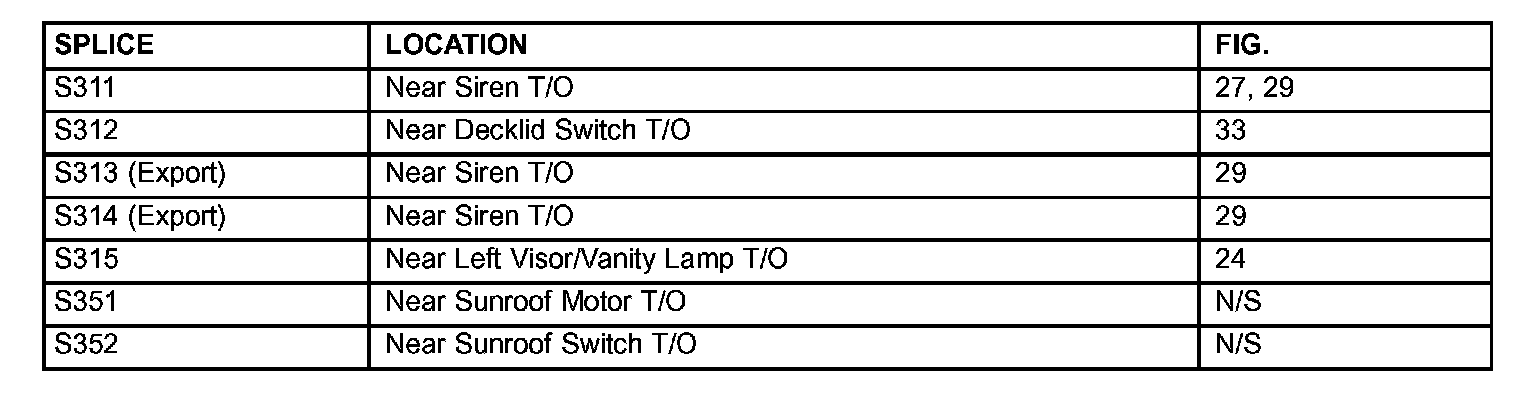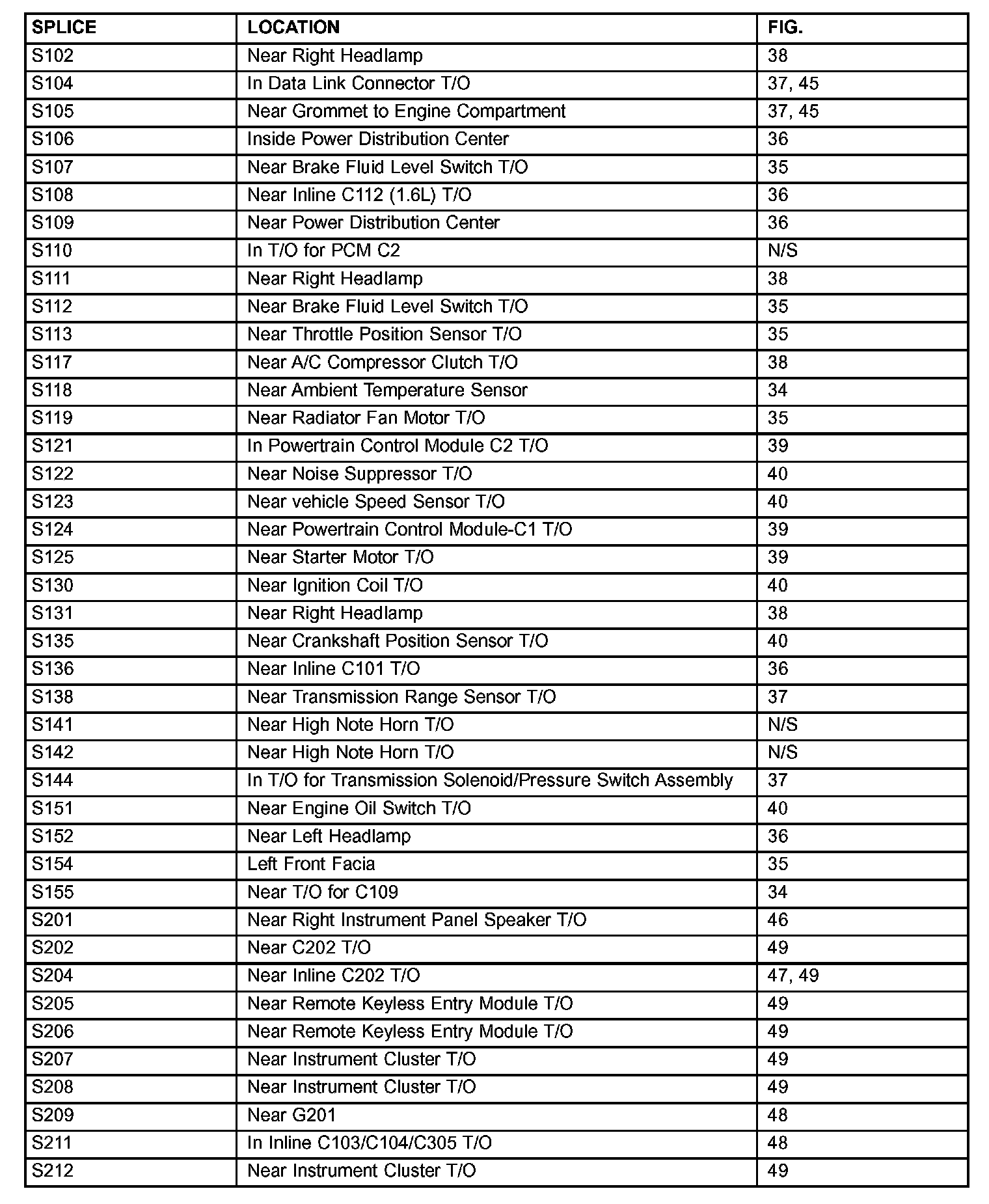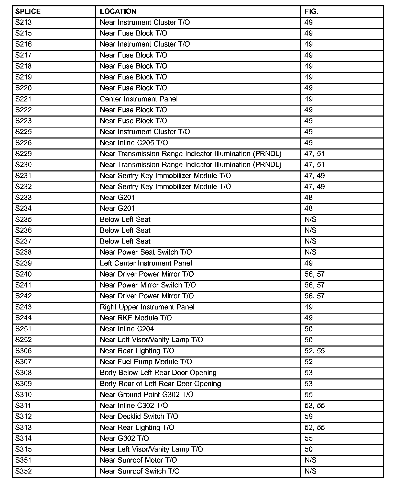 The abbreviation T/O (Take Out) is used in the location column to indicate a point in which the wiring harness branches out to a component.