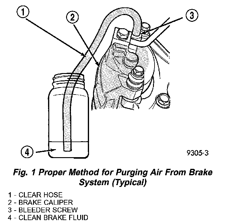 1. Attach a clear plastic hose to the bleeder screw and feed the hose into a clear jar containing enough fresh brake fluid to submerge the end of the hose (Fig. 1).
