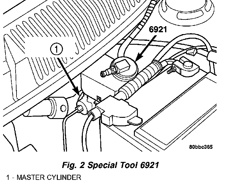 1. Attach Adapter, Special Tool 6921, to the master cylinder reservoir (Fig. 2).
