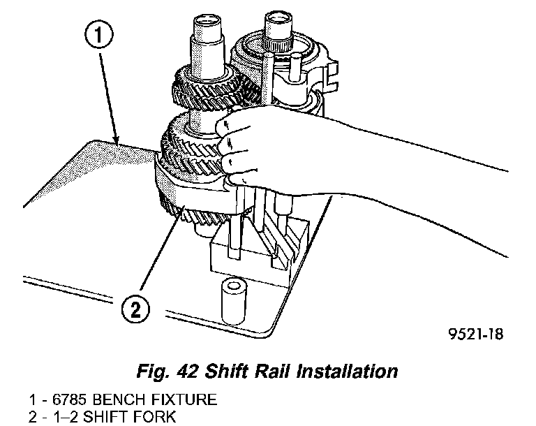 2. Install shift rails and forks into bench fixture (Fig. 42).