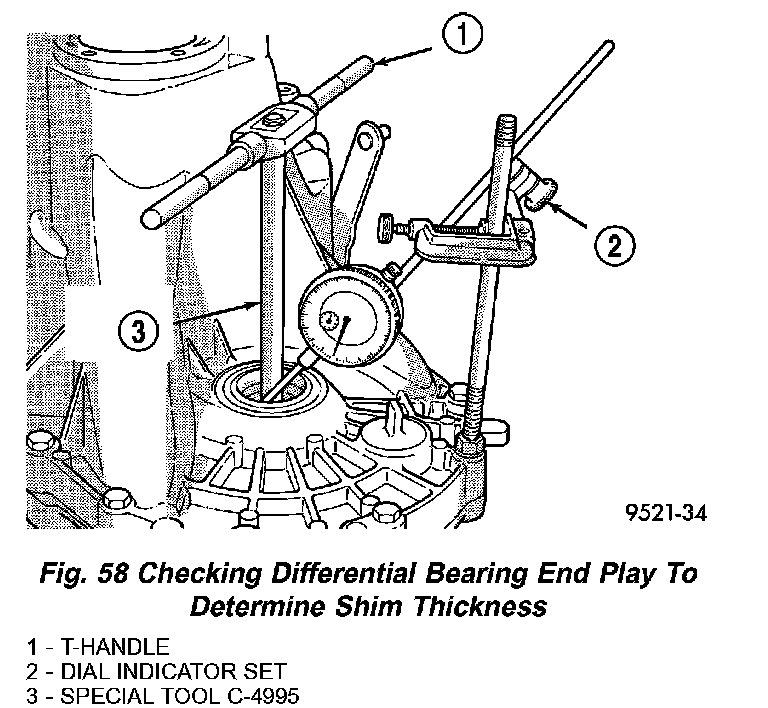 6. Apply a medium load to differential with Tool C-4995 and a T-handle, in the downward direction. Roll differential assembly back and forth a number of times. This will settle the bearings. Zero the dial indicator. To obtain end play readings, apply a medium load in an upward direction while rolling differential assembly back and forth (Fig. 58). Record end play.