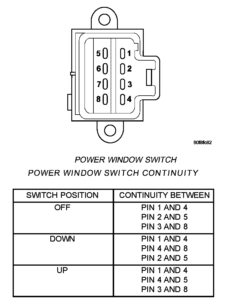 Remove the switch from its mounting, Using an ohmmeter, test the window switch for continuity in all positions Refer to Power Window Switch Continuity table to determine if continuity is correct. If the correct results are not obtained, replace the switch.