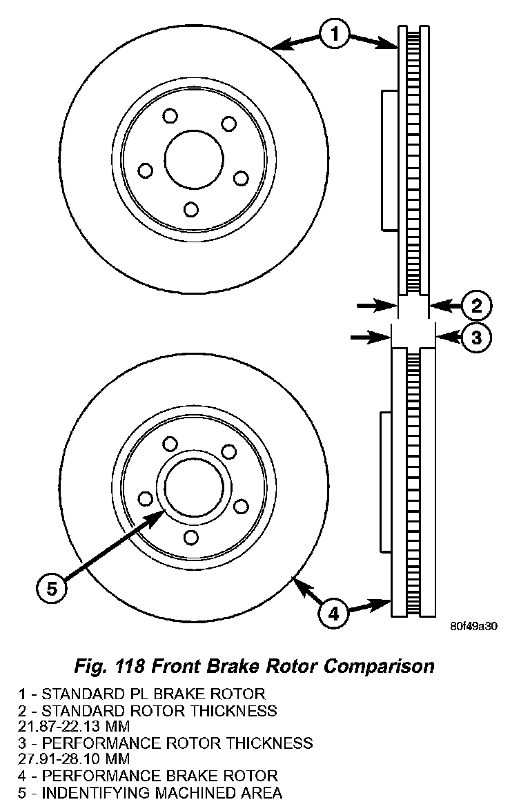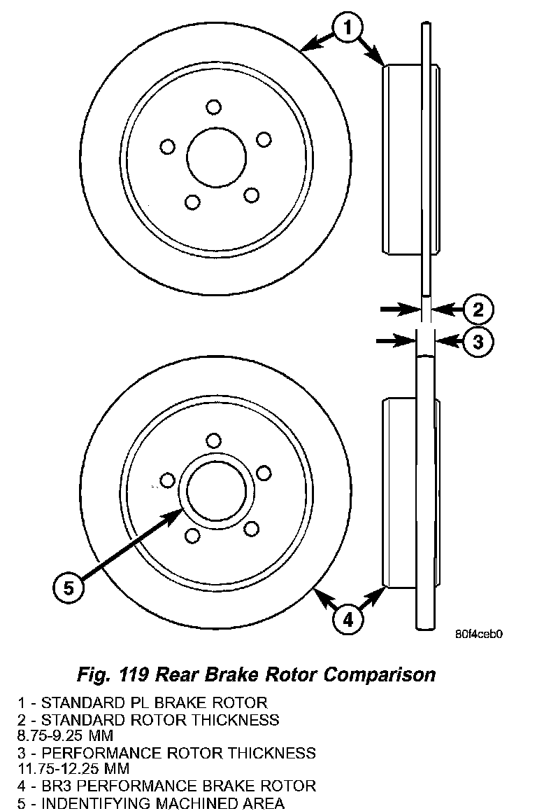 Vehicles equipped with the brake sales code BR3 (Performance Disc/Disc brake combination) use heavier brake rotors. The BR3 front brake rotor is approximately 6 mm thicker than the standard front brake rotor. The BR3 rear brake rotor is approximately 3 mm thicker than the standard rear brake rotor. The BR3 brake rotors can be easily identified by the recessed machined area near the hub center (Fig. 118) (Fig. 119).
